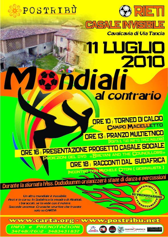 Infine musica, danza e cibo multietnico e soprattutto un invito ad iscriversi al Torneo di Calcio “al contrario” che si terrà la mattina alle 10 presso il Campo Macelletto di Rieti. www.postribu.net – post.tribu@gmail.com – 3474807602 – 3483431837
