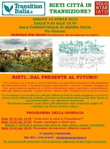 Sabato 14 aprile 2012, dalle 9:30 alle 18:30 presso la sala parrocchiale di Regina Pacis (piazza Matteocci) si svolgerà un “transition day”, giornata dedicata alla transizione (quella che ci sta portando alla “non-più-dipendenza” dai combustibili fossili) e facilitata da Deborah Rim Moiso (Movimento della Transizione in Italia).