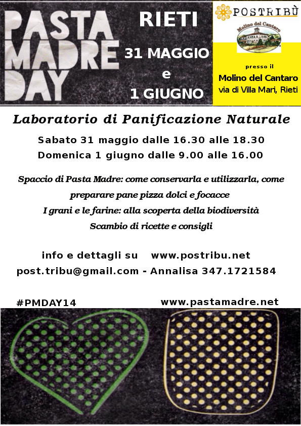 Il 31 maggio e 1 giugno Postribù è lieta di invitarvi al laboratorio di panificazione naturale, che si svolgerà in occasione del “Pasta Madre Day” (31/05/2014), evento che coinvolge tutta l’italia nello “spaccio” di pasta madre e la diffusione di notizie e pratiche sul fare il pane in casa.