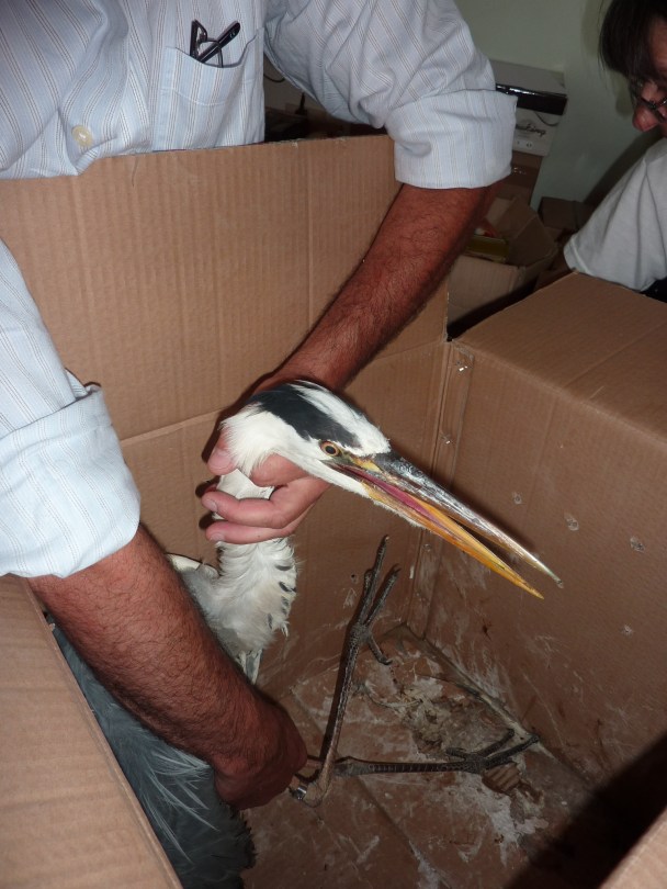 un airone rimasto impigliato in una rete