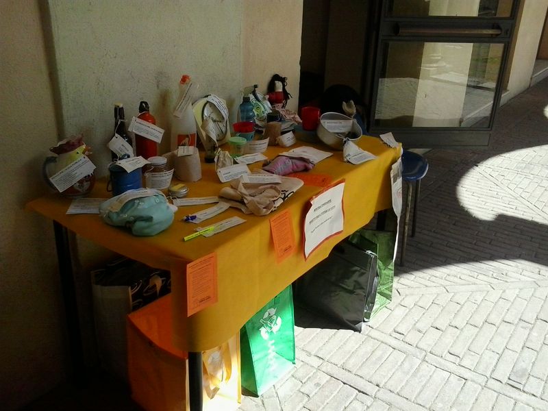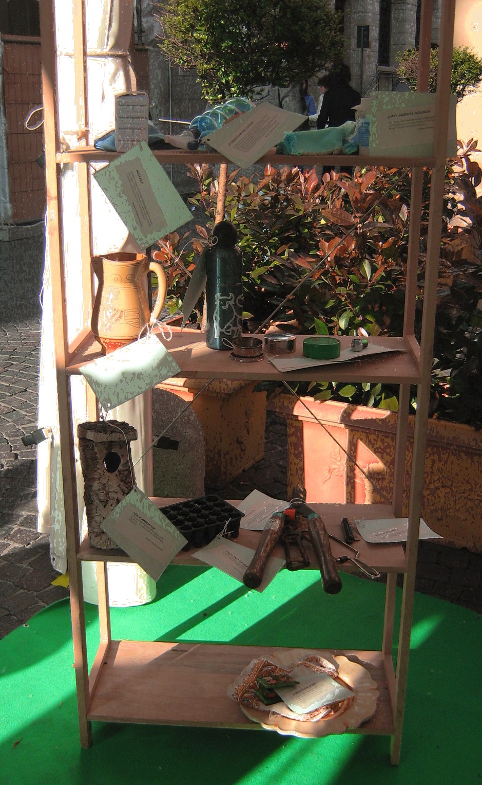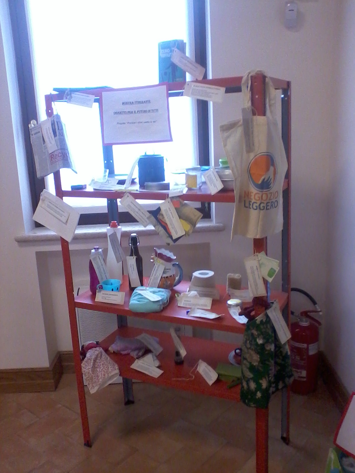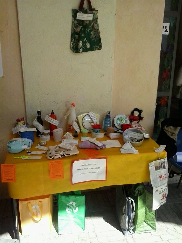 Oggetti e strumenti durevoli del futuro vengono contrapposti a oggetti usa e getta di un passato fossile, corredati di cartellini di spiegazione.