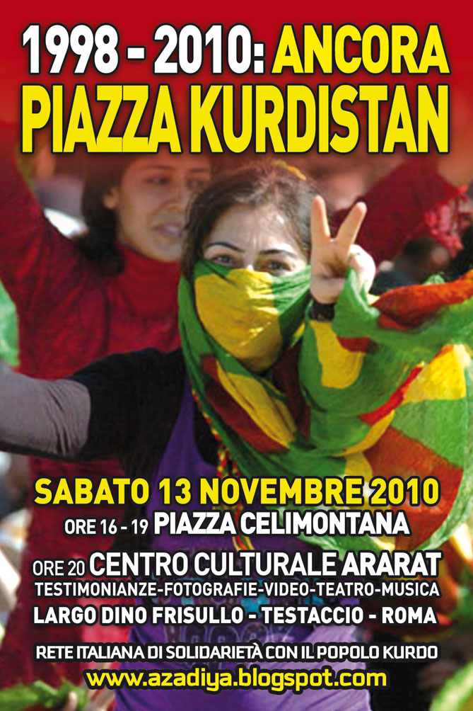 Sabato 13/11 a Roma , nell’occasione dell’enorme festa-mobilitazione per la venuta di Ocalan a Roma il 12 novembre 1999 ( p.za Celimontana fu ribattezzata Piazza Kurdistan) , la Comunità Kurda in Italia e le associazioni che sostengono i diritti del popolo kurdo danno appuntamento per una iniziativa di solidarietà e lotta a fianco del popolo kurdo, che si articola in due momenti : ore 16 – 19 in Piazza Kurdistan(p.za Celimontana) ,