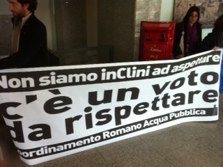 In occasione della Giornata Mondiale dell’Acqua il Coordinamento Romano Acqua Pubblica ha occupato il Ministero dell’Ambiente per chiedere il rispetto del voto referendario di giugno. Sono in questo momento all’interno del Ministero 30 attivisti, con megafoni, striscioni e bandiere. Un mese fa il Forum fu ricevuto dal Ministro Clini che però non ha mantenuto la promessa di attivarsi per far rispettare i referendum. Nello striscione più grande c’è scritto: Non siamo inClini ad aspettare, c’è un voto da rispettare.
