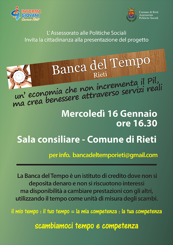 Il Sindaco Simone Petrangeli e l’Assessore alle Politiche sociali, Stefania Mariantoni, insieme a Informagiovani e PosTribù, presenteranno alla stampa, mercoledì 16 gennaio alle ore 16,30 in Sala consigliare, la Banca del tempo.